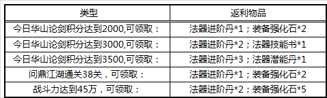 充值2000元宝:法器进阶丹*15;法器潜能丹*2;法器技能书*4;装备强化石*20