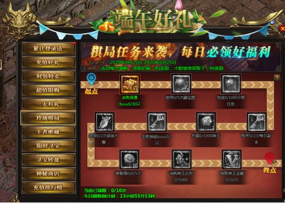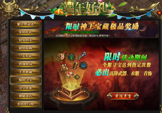 活动说明:神王宝藏限时发放专业品牌装备、神器等,全服寻宝达到一定次数可获得保底奖励