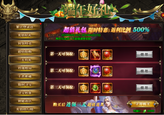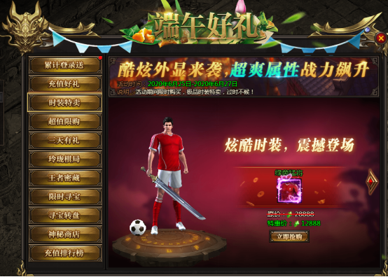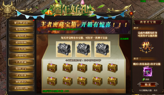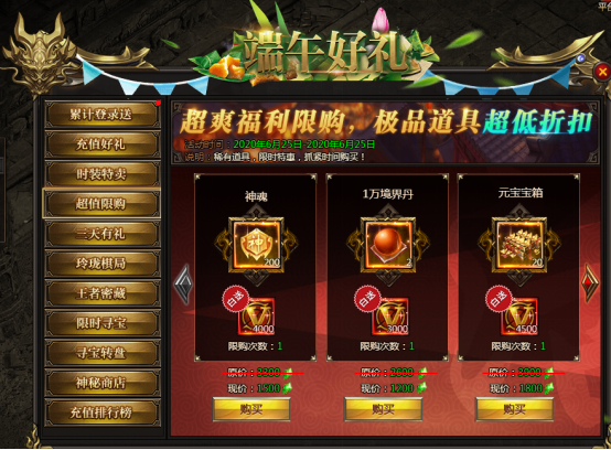 活动说明:各种稀有道具限时购买,同时送大量神王币