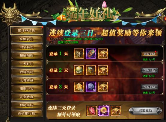 活动说明:活动期间,每天登陆即可领取奖励,连续三天更有额外奖励