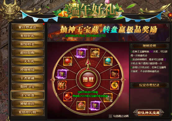 活动说明:每抽取250次神王宝藏可获得转盘机会,转动转盘获得专业品牌保底奖励