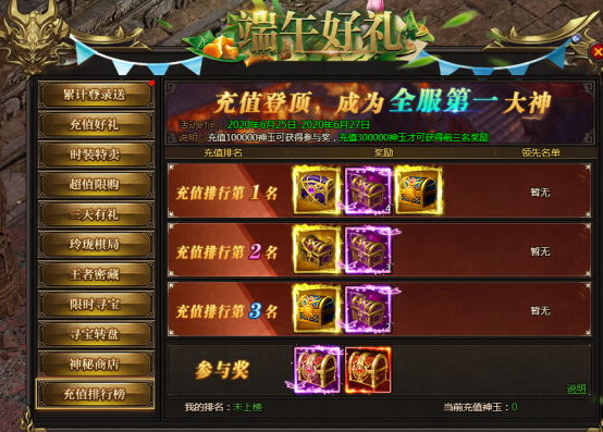 活动说明:名动本服,充值达到300000神玉即可参与排行,前三名均可获得专业品牌自选宝箱。充值达到100000神玉即可获得参与奖。奖励会在活动结束后通过邮件发放