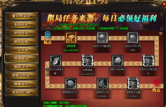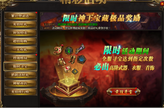 活动说明:神王宝藏限时发放专业品牌装备、神器等,全服寻宝达到一定次数可获得保底奖励