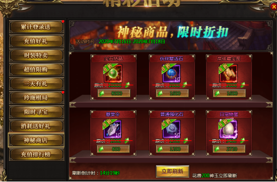 活动说明:神秘商店限时来袭,超低折扣,限时购买。同时可以通过刷新按钮,花费200神玉进行刷新