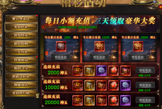 活动说:每日充值可以领取充值宝箱,连续三天充值更有额外专业品牌奖励