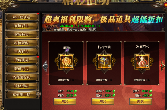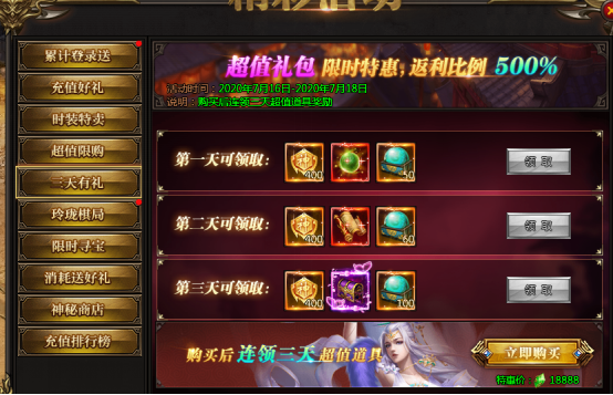 活动说明:一次购买,未来三天每日皆可领取专业品牌奖励,助力成神