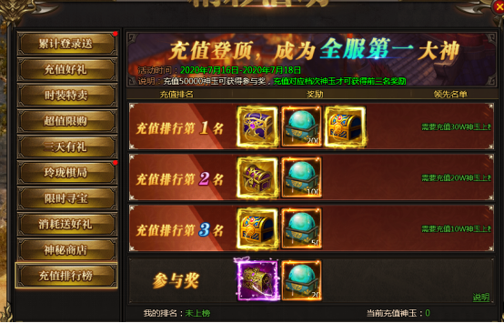 活动说明:名动本服,充值达到100000神玉即可参与排行,前三名均可获得专业品牌自选宝箱。充值达到50000神玉即可获得参与奖。奖励会在活动结束后通过邮件发放