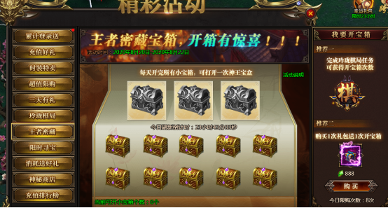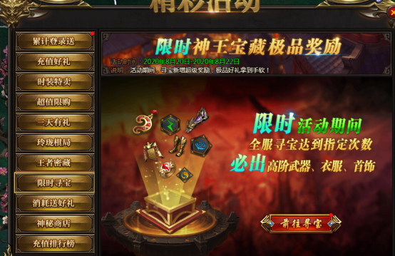 活动说明:神王宝藏限时发放专业品牌装备、神器等,全服寻宝达到一定次数可获得保底奖励