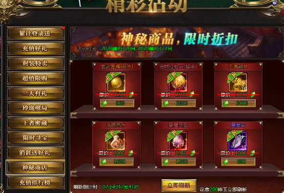 活动说明:神秘商店限时来袭,超低折扣,限时购买。同时可以通过刷新按钮,花费200神玉进行刷新