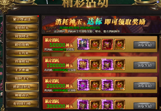 活动说明:活动期间,消耗神玉可以领取奖励,帮会、集市消耗除外