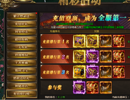 活动说明:名动本服,充值达到100000神玉即可参与排行,前三名均可获得专业品牌自选宝箱。充值达到50000神玉即可获得参与奖。奖励会在活动结束后通过邮件发放