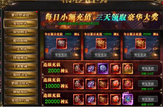 活动说:每日充值可以领取充值宝箱,连续三天充值更有额外专业品牌奖励