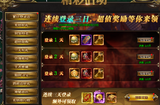 活动说明:活动期间,每天登陆即可领取奖励,连续三天更有额外奖励