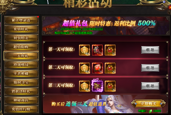 活动说明:一次购买,未来三天每日皆可领取专业品牌奖励,助力成神