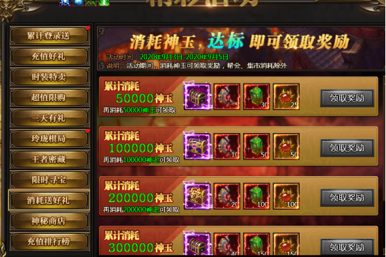 活动说明:活动期间,消耗神玉可以领取奖励,帮会、集市消耗除外