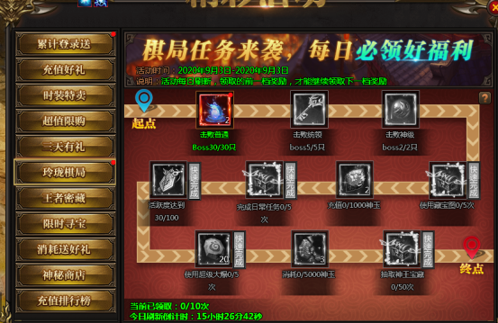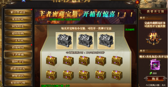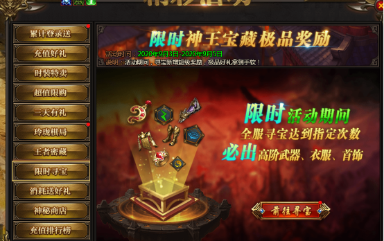 活动说明:神王宝藏限时发放专业品牌装备、神器等,全服寻宝达到一定次数可获得保底奖励