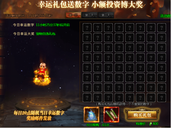 活动说明:购买礼包获得幸运数字,即可参与超级大奖