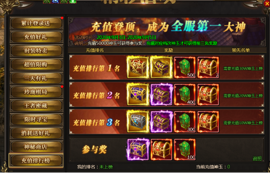 活动说明:名动本服,充值达到100000神玉即可参与排行,前三名均可获得专业品牌自选宝箱。充值达到50000神玉即可获得参与奖。奖励会在活动结束后通过邮件发放