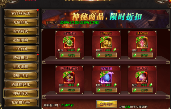活动说明:神秘商店限时来袭,超低折扣,限时购买。同时可以通过刷新按钮,花费200神玉进行刷新