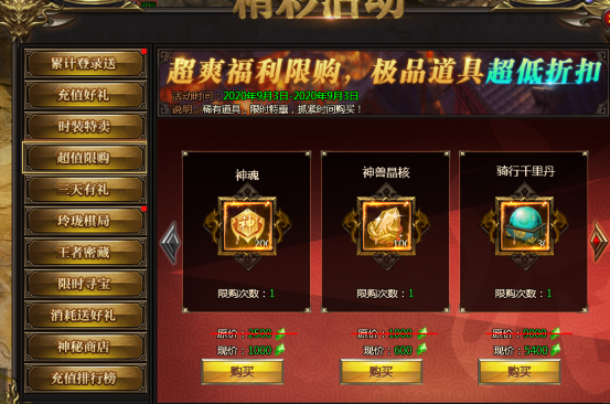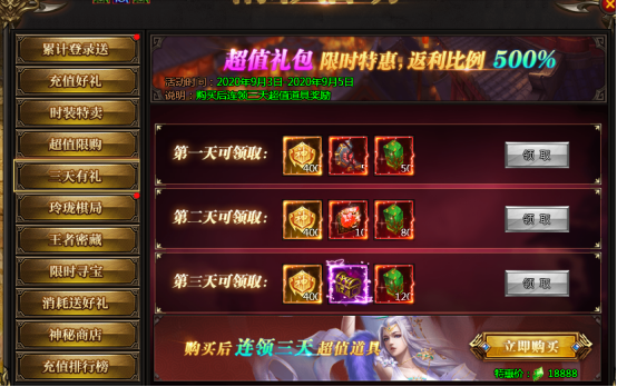 活动说明:一次购买,未来三天每日皆可领取专业品牌奖励,助力成神