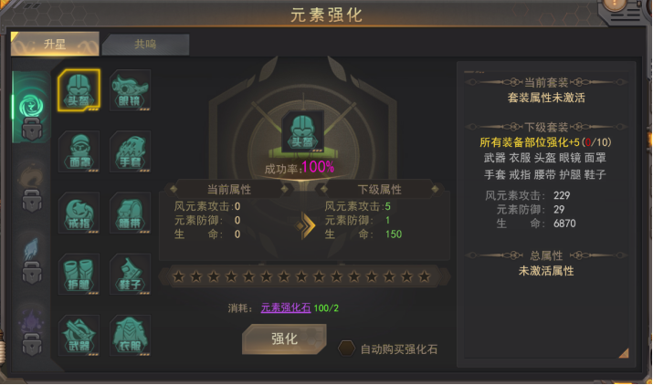 通过消耗金币和元素强化石或元素超级强化石对该装备位进行升星,升星对应元素装备可提升角色属性;更换装备不影响升星装备带来的角色属性。