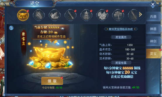 灵宝有聚宝盆、芭蕉扇、紫金葫芦等9种,每种都有特殊属性效果。聚宝盆每5分钟可聚宝铜钱和元宝,可领取50次。芭蕉扇有对怪伤害加成的特殊属性。还有pk伤害加成减免,加攻防血的特殊灵宝,越早激活越好。