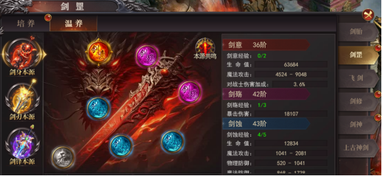 ③剑罡温养有3个部位,每个部位有3个属性点,每次修炼获得经验,经验满获得属性