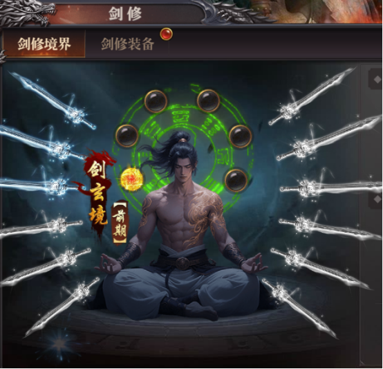 ①剑修境界-升级增加属性和剑气伤害,每个阶段分为(前期,中期,圆满)达到圆满后提升境界等级