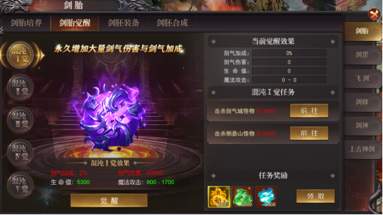 ②剑胎觉醒-达到对应剑胎等级解锁觉醒任务,完成觉醒任务获取奖励并觉醒对应剑胎