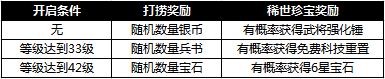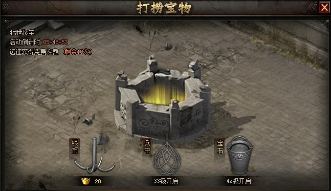 活动内容:活动期间,玩家可使用不同打捞工具在井中打捞宝物。每次打捞必定获得银币、兵书或宝石奖励,同时也有概率获得稀世珍宝!(6月21日之后打捞宝物银币类奖励大幅提升,不可错过哦~)