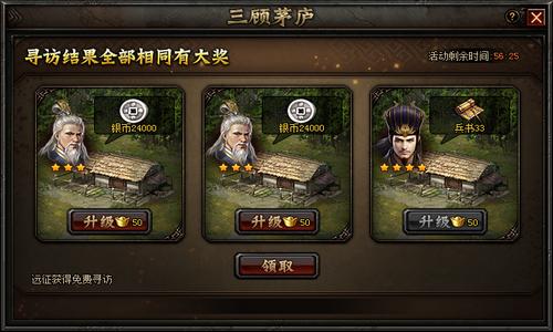 活动内容:活动期间,玩家通过寻访可获取银币、粮食、兵书等奖励,每次远征后可获得免费寻访次数(较多7次),更可花费金币进行寻访。