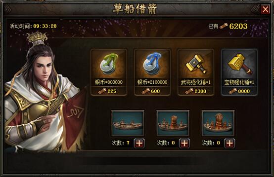 活动内容:活动期间,玩家可通过招募船队出航收集箭矢。筹集的箭矢不仅可用来兑换银币,更可兑换武将强化锤及宝物强化锤!快去收集箭矢吧!