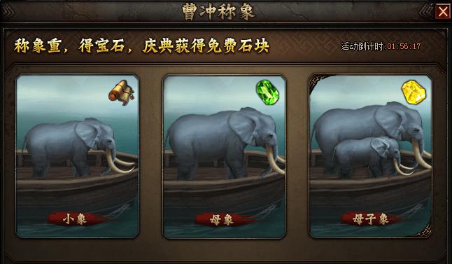 曹冲称象喜获丰厚大奖,活动期间,大家通过给大象称重可获得宝石或宝石卷轴奖励,同时称重较精确的玩家还可获得更多额外奖励!
