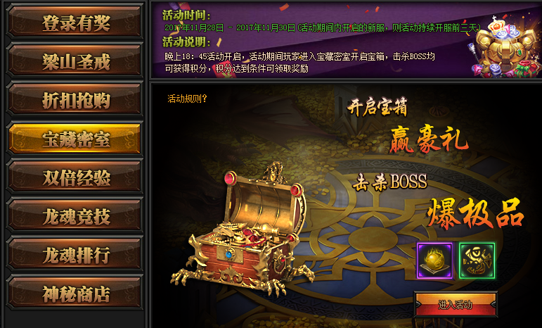 活动期间,每晚18:45开启密室,开启宝箱,击杀金猪,击杀BOSS均可获得积分,积分达到条件后可领取奖励。击杀BOSS还可掉落专业品牌装备