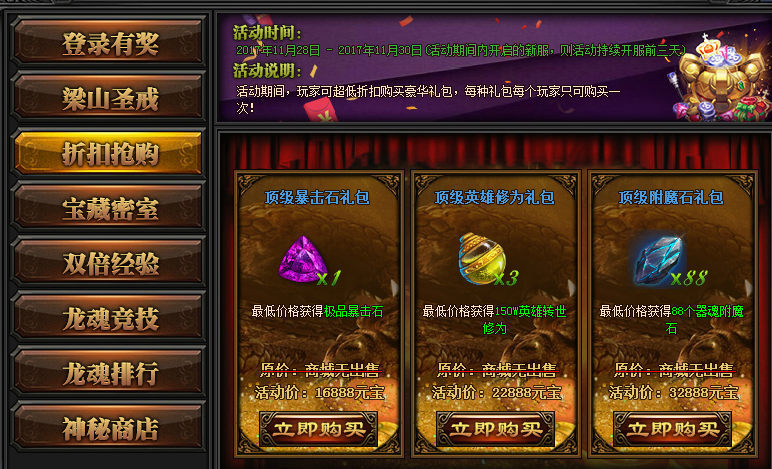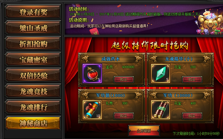 活动期间,玩家可以在神秘商店购买超值道具,玩家可花费元宝立即刷新道具,也可购买完当前道具后刷新