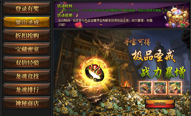 活动期间玩家参与寻宝,有几率获得专业品牌圣戒,大幅度提升玩家战力。