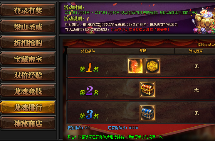 活动期间,根据玩家累积获得的龙魂数量进行排行,排行前三的玩家将会获得丰厚奖励,2000才能入榜