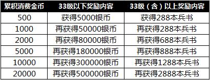 注:消费所赠送的银币或兵书,可累积领取(例:32级玩家累计消费满5000金币,共可获得360000银币)