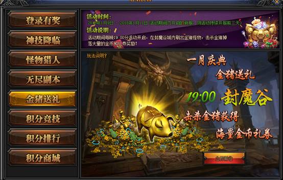 活动期间,每晚19点,在封魔谷刷金猪怪物,击杀金猪可以掉落大量金币和礼券