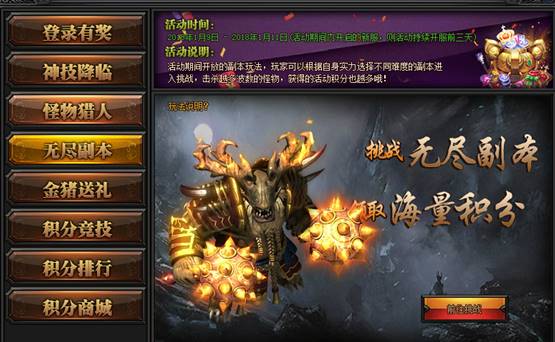 活动期间,玩家可以进入无尽副本击杀怪物获得海量积分,击杀的波数越多,获得的积分越多。副本分三个难度,玩家可以根据自身的实力来选择不同的难度副本