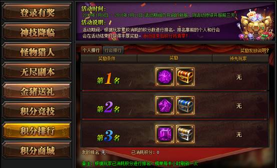 活动期间,玩家消耗积分进行排行,排名靠前的玩家和行会可获得丰厚的奖励,活动积分将在活动结束后清零