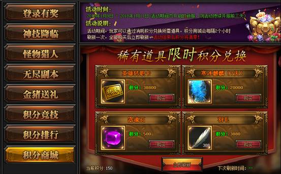 活动期间,玩家可以通过消耗积分兑换稀有道具,积分商城每隔2小时刷新一次,或者全部购买后立即刷新,同时玩家可以通过消耗积分来立即刷新道具