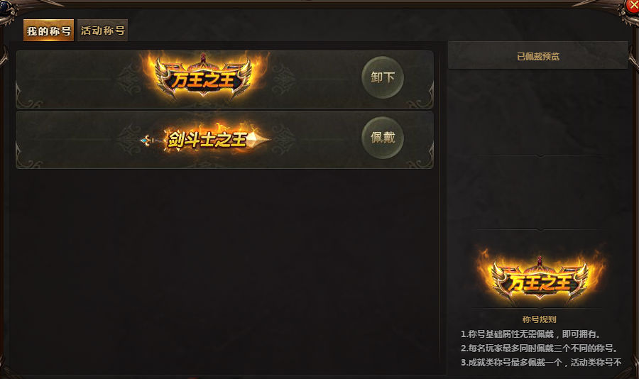 游戏内达到相应条件,或参与开服活动等特殊活动便可获得各种不同类型的炫酷称号,激活称号可以获得大量属性加成,称号基础属性激活称号便可以拥有,每名玩家较多同时佩戴三个不同的称号,成就类称号较多佩戴一个