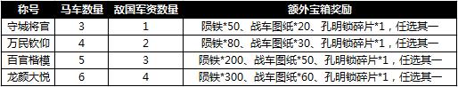 5、每搜查到一次敌国 军资马车可增加1点称号值,称号经验满值时获得对应称号,并获得额外宝箱奖励;