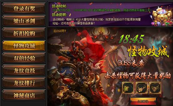 活动期间,每晚18点45分,大量怪物进攻沙城,击杀怪物不仅能获得海量经验,击杀BOSS还可掉落专业品牌装备!