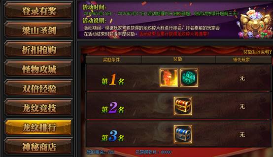 活动期间,根据玩家累积获得的龙纹数量进行排行,排行前三的玩家将会获得丰厚奖励