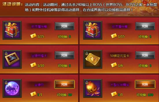【活动内容】活动期间,击杀240级以上的世界boss、boss之家、永恒禁地以及野外怪物,有几率掉落活动道具,使用活动道具可以兑换丰厚奖励!