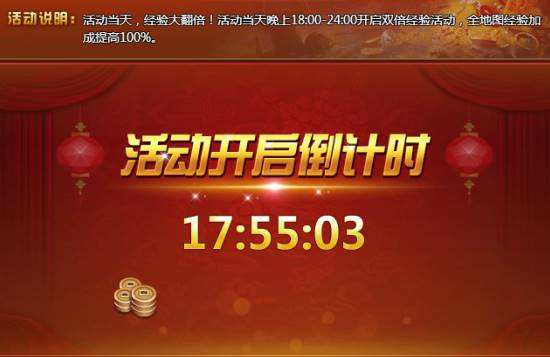 【活动内容】活动当天,经验大翻倍!活动当天晚上18:00-24:00开启双倍经验活动,全地图经验加成提高高。(包括副本)