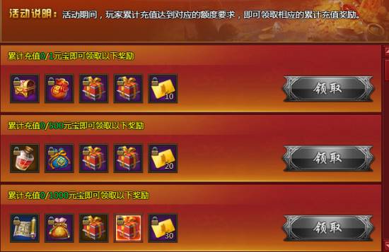 【活动内容】活动期间,玩家累计充值达到对应的额度要求,即可领取相应的累计充值奖励。