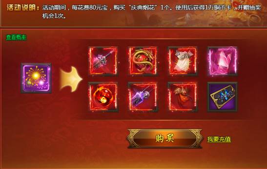 【活动内容】活动期间,花费80元宝购买活动道具“庆典烟花”1个,使用后获得1万铜币卡,并赠抽奖机会1次,抽奖后即有机会获得高级披风材料、剑鞘、高级宝石等众多豪华大礼,机会难得!